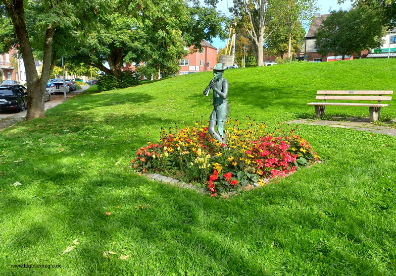 Der Flötenspieler in der Eilendorfer Steinstraße umgeben von einem Blütenmeer